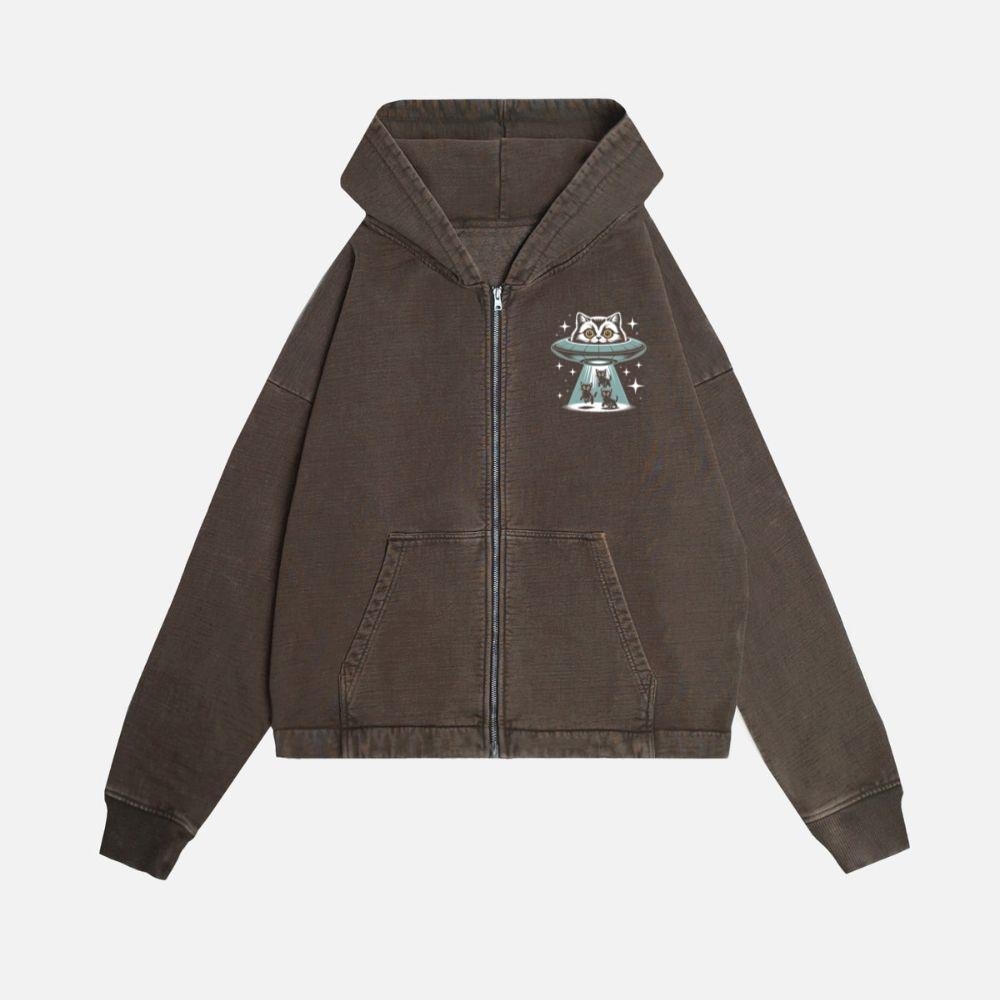 UFO Cat Abduction Funny Alien Graphic Zip Hoodie
